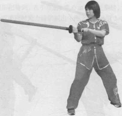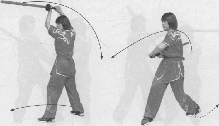 左脚在前,双手握剑柄,左手在前,转腰向右托剑于额前,力达剑身后部; 上动不停,两手持剑落于身体右侧,上右步转腰,双手随腰迅速发力斩剑(图 2-107 ~ 图 2-109 )。〇m 2- 109