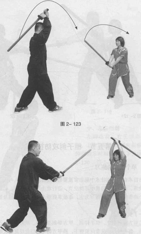 攻防技术在相子剑技术中是非常重要的,攻防之间产生人与人之间对峙 的紧张关系,在彼此的较量中寻找空当,进行攻击与防守练习。初级阶段练 习以单个动作的两人攻防练习为主,逐渐掌握两人对抗的距离感及器械的攻 防感受。(一)劈的练习甲乙双方相对而立,双手持剑,甲方举剑至头顶,顺势下劈,乙方同时 后退一步,将剑举起,接着向前劈下,换甲方防守。以此反复数次练习(图 2-123、图 2-124) 〇图 2- 124