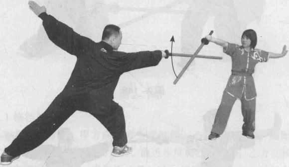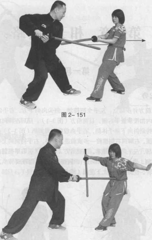 甲左脚在前,双手持剑向乙上部下劈,乙右脚在前,速双手持剑用剑身 格开甲方来势,继而上步直扎甲方胸腹部。甲变换flj式横于身前,向下格挡 乙方平扎之势,并顺势向前下刺击乙方腿部,乙退i抽剑回收向前下裹拿对 方器械,甲再次向上直刺乙方头部,乙转身轮劈对方头面部。此组合变化多 端,招招连贯。甲格挡来势是应含胸收腹,力达剑身下部,格开乙方雷霆之势; 乙转身轮劈应迅速变换步法转身,抓住间隙,时不我待(图2-150 ~图2-152 )。