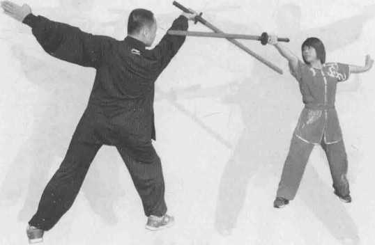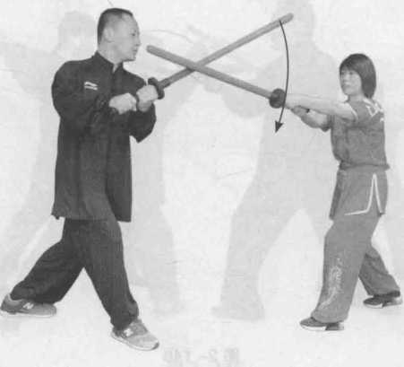 甲方收势,用拦剑法剪击乙方手腕,乙方手腕外旋,持剑垂直下切甲方 手腕或小臂(图2-146)。乙方反手下切是走内线,以比对手近的线路而先击 中对方手腕或小臂,抢先断其根部。