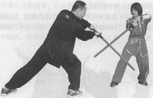 甲方平刺乙方胸腹部,乙方含胸,不使甲方短兵锋端触及身体,同时前 手持剑扣腕运用“拿”剑前梢剪击甲方腕部(图2-145 )。拿腕要发力清脆、 短促,手腕随小臂内旋而上悬下扣。吞胸与剪腕同时进行,吞胸幅度要大, 剪击对方手腕时,要探伸手臂,放长击远。