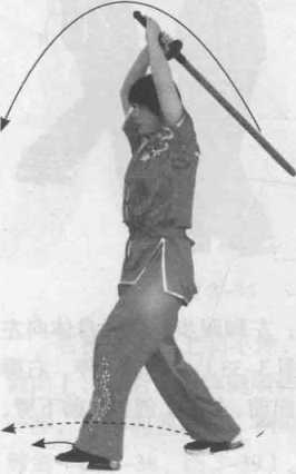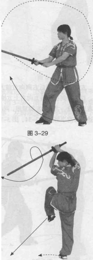 转身抡劈:上身立直,向左转90度,双手持剑举至头顶,剑尖向下(图 3-28);双手持剑由右后方向前上方撩剑,继续向左转腰,同时双手持剑下劈(图 3-29 )。图 3-28金鸡独立:双手持剑经体向右拦剑, 转腰向右转90度,剑尖向下;重心不变, 保持在右脚,提左膝,右手持剑在体前, 以腕为轴向上向左画弧点剑,双手阴阳 把握剑提于额前,眼睛目视左前方,呈 独立式(图3-30 )。