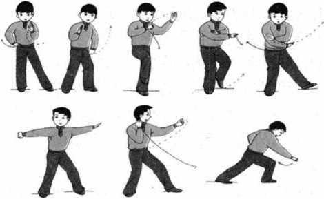 右下落至齐胸高,拇指、食指自然伸展,余指自然屈向掌心,掌指朝 左前方,掌心斜向上,右臂屈肘外旋,向上、向左划弧于右肩前,拳 心向后,随即身体左旋,略前倾,重心移向左脚,呈左弓步,右腿略 屈,同时左手向右、向下划弧,经胸前略内旋,向左收于左腹前,掌 心轻贴腹部,右拳由肩前继续向左、向下划弧,经胸前内旋,从左手 心向左前下方抖弹发出,臂略屈,拳心斜向下,目视石拳。