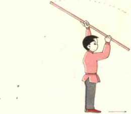 (2) 下蹲与摔棍要协同,可以先练习两腿原地全蹲,同时摔棍;