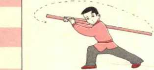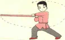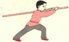 抡棍属于远距离进攻法,常在横击对方肋部、腰部时使用。1.动作方法(见图4-2-3)(1) 两手紧靠,满把正握于棍身后段,将棍平背于右肩上,重心 偏右脚,呈右弓步;(2) 两手用力使棍由右经体前向左平抡,背棍于左肩,呈左弓 步。2.注意事项(1) 把长要适宜,留把太少,会平抡无力,留把太多,棍把易触 碰胸部,可在抡棍前轻轻来回试论一次,确定握棍部位;(2) 平抡时两手注意旋腕,抡棍要平,力达棍身前端,配合腰腿 力量,呼呼生风;(3) 要结合左右弓步的变化,左右平抡,可先做慢动作,注意腕 的旋翻,逐步加速加力。图 4-2—3