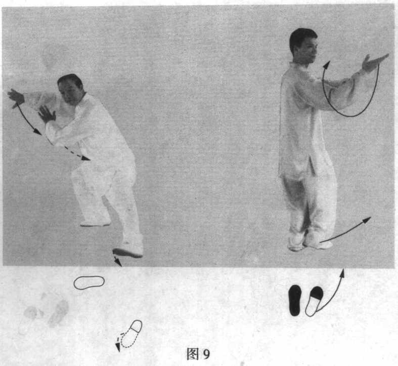 乙重心移向左腿,右脚尖离地,以脚跟为轴,向内扣转约 45。并落实,同时,身体微向左转,胸向左前方。(图5)