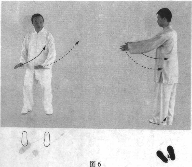 乙两臂自下而上向前慢慢举起,两肘微屈,两掌指尖朝 前,两手高度略低于肩,并与肩同宽,掌心相对;目视前方。 (图6)