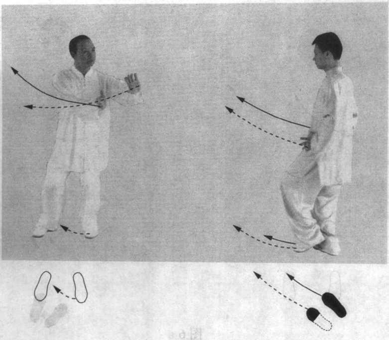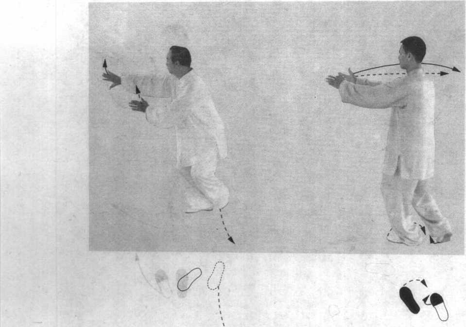 ② 甲重心略移向左腿;同时,两手向左斜上方划弧,左臂 内旋微屈,左掌心斜向外,略低于肩;右臂外旋微屈,右掌心 斜向外,置于左胸前;眼随手而动,视左斜前方。