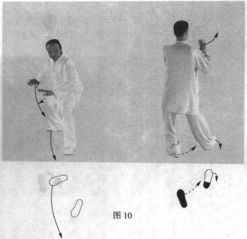 乙重心略右移,内扣左脚,再重心左移至左腿,右脚前掌 为轴碾转并脚跟提起;随即身体向右后方转动,带动两臂外 旋,平行右摆,右臂微屈,掌心朝上;左臂屈曲内旋,掌心朝 下,附于右前臂内侧;眼随右手而动,视右侧后方。(图9)