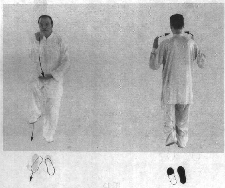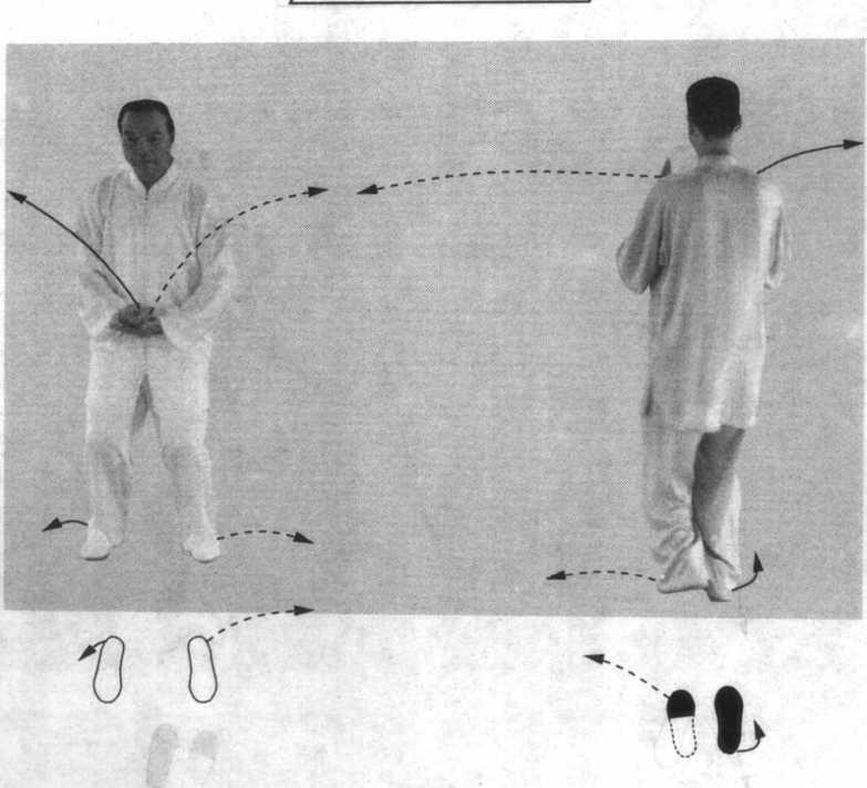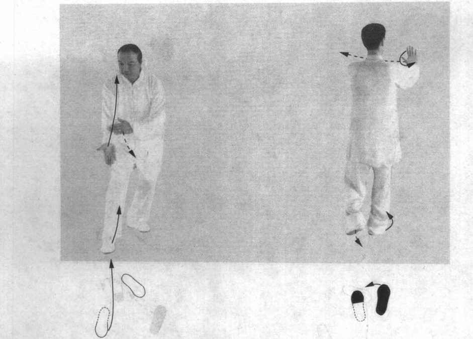 同时,两手顺势 向右后方平推;眼转向前下方。