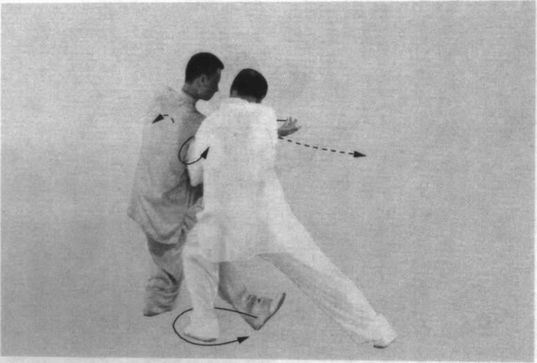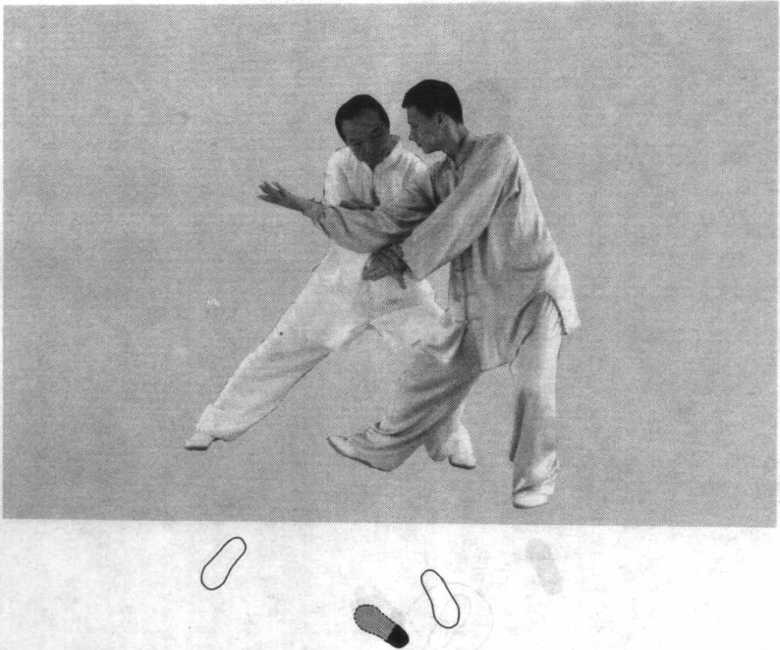 乙当甲肩臂将靠到胸、肋时,坐胯并向右转腰,重心移至 左腿,左腿屈膝,右脚尖翘起,右腿微屈成右虚步;同时,右 臂顺势前伸,含胸收腹以化解甲之靠劲;眼视前下方。(图 61、图61附图)