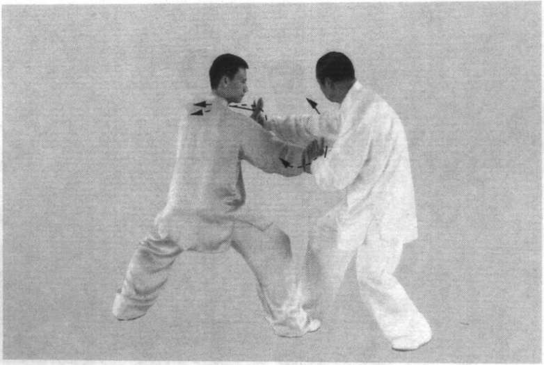 甲在含胸、拔背、坐胯的同时,左掌心沾贴乙的右前臂, 向右下方横推;眼随视右侧方。