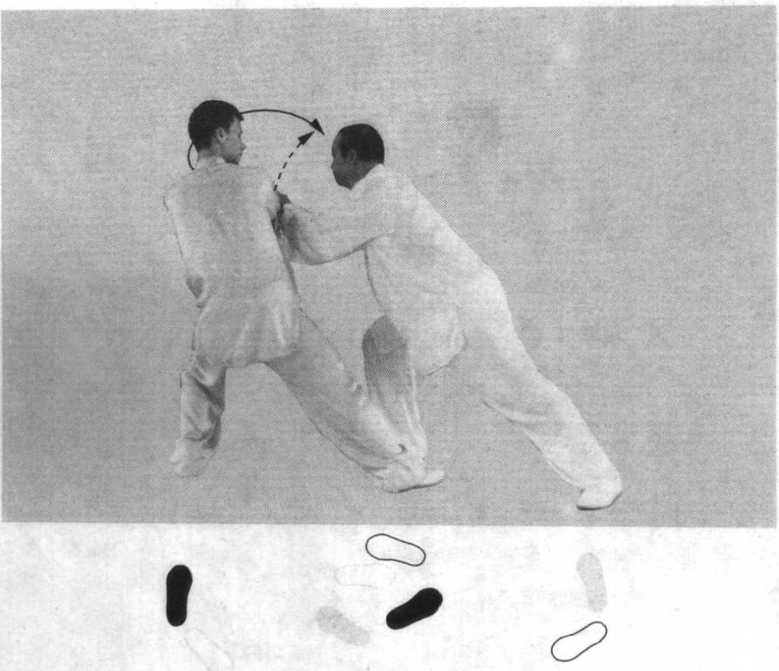 ② 乙在甲换步按化时,随势松腰、坐胯,重心移向左腿,