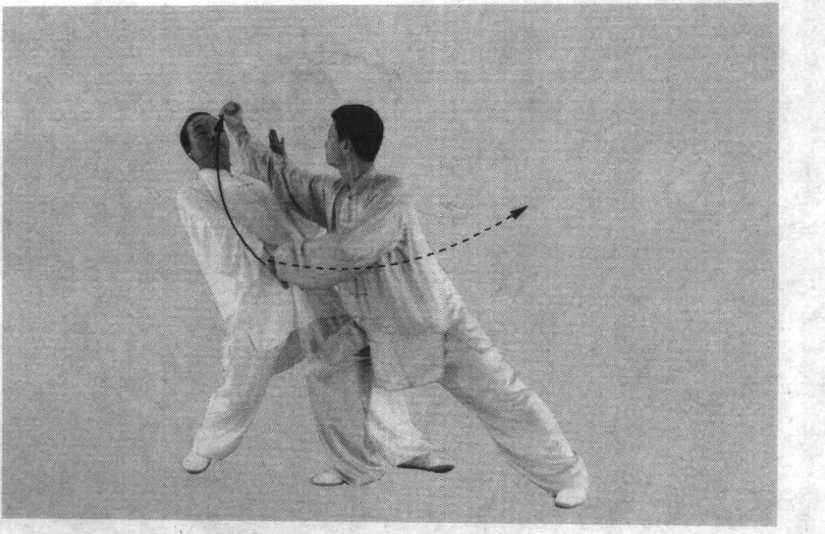 ② 乙在化解甲撅臂时要含胸转腰,然后再重心前移,略俯 身劈击甲面,充分体现“舍己从人”和“化而后发”的太极拳 攻防原理。