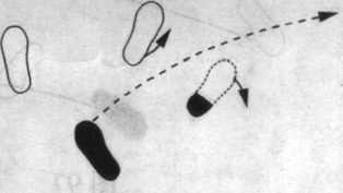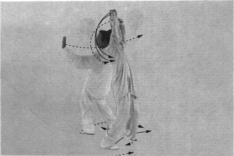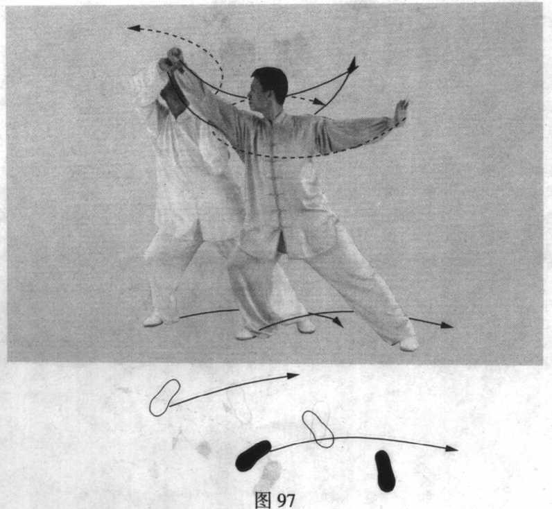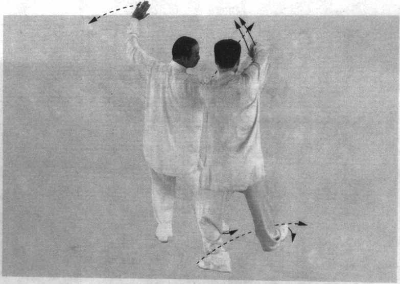 乙随之扣左脚,向右后转体,随即右脚上一大步,脚后跟 先着地;同时,右臂内旋划弧,举于右斜上方;左掌随之经下 向前划弧,沾贴甲右前臂;眼随右手。(图97、图98)