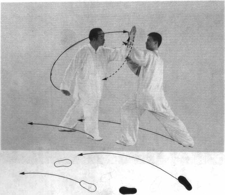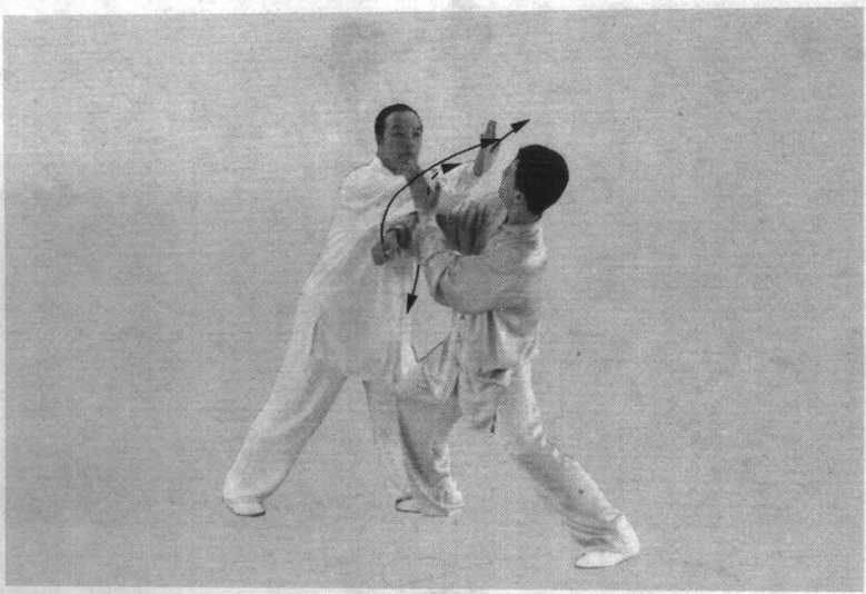 甲继上势不停。当被乙云拨重心欠稳时,迅即左转腰以随