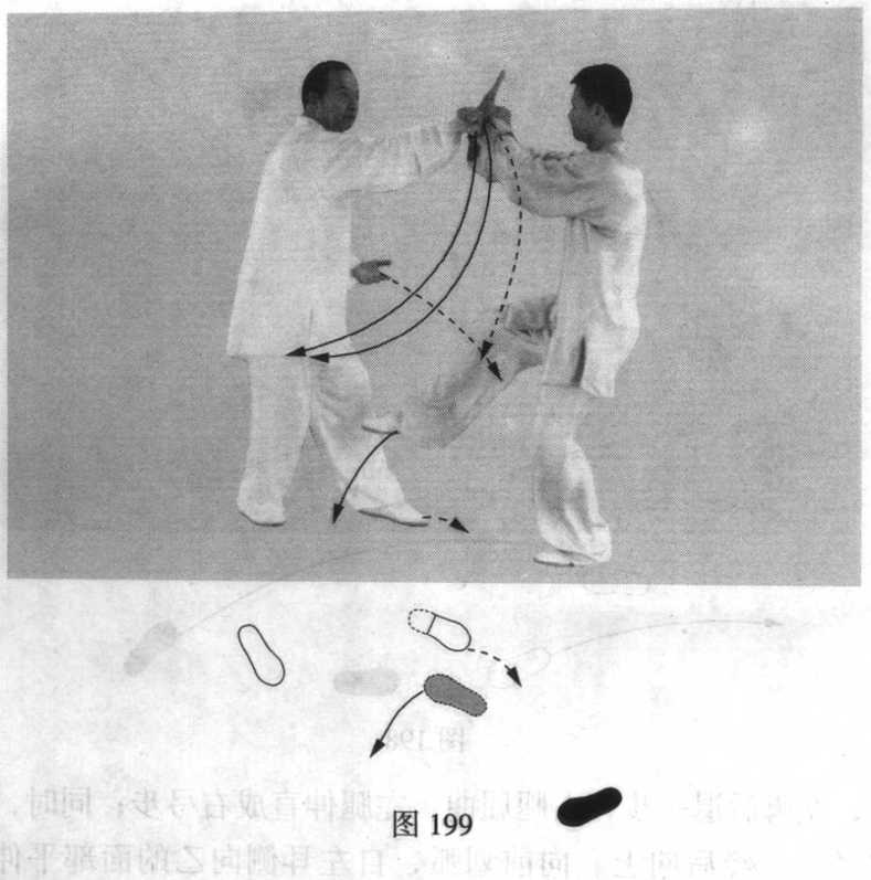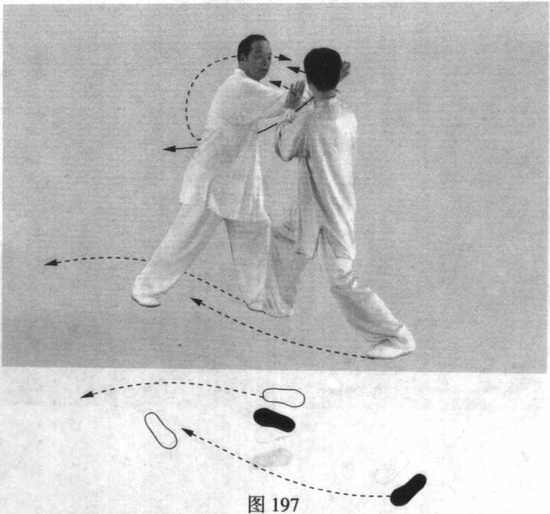 甲当乙两手向右动拨时,右臂挪住乙的两手不丢;同时, 略向左转腰以随之;左掌落按于左胯旁,掌心向下;眼视乙面 部。(图197)