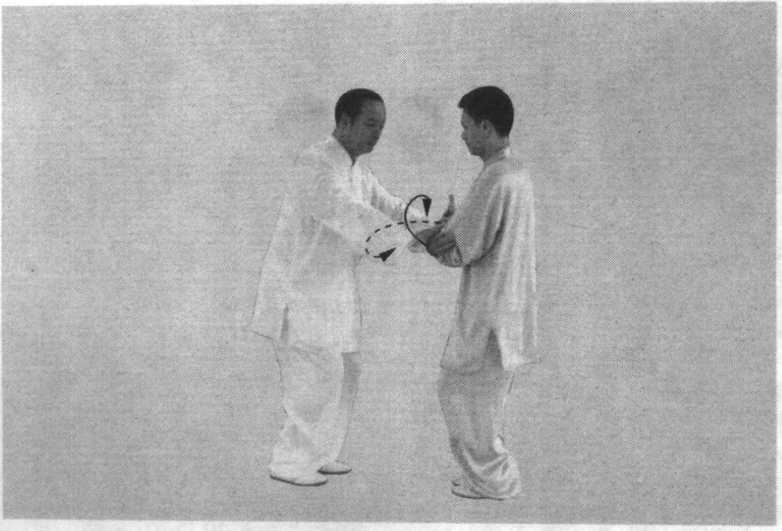 乙随甲双捆右手,向右、向上划弧,右腕沾贴甲右腕前 棚,掌心向内;右手随划弧沾贴甲右肘处,形成双捆势;同时 重心后移至左腿;眼视甲面部。(图214)