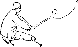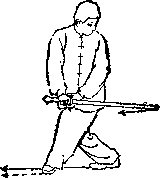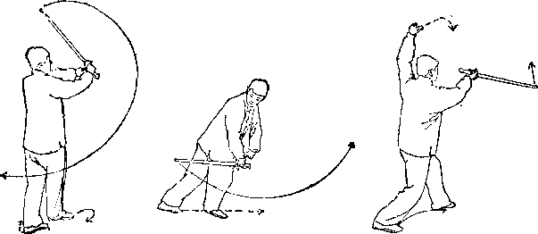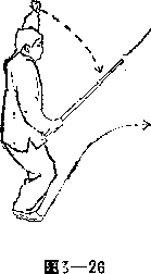 紧接上动右脚向前垫半步,脚尖外展体向右后转重心下降两腿交叉成右高蛇盘步体转同时右手压握剑与左手剑指一齐使剑向前下,经右腿外再向后上抄起口目视剑尖图3—24)