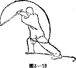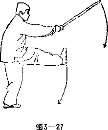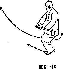 (1) 左勾剑左脚向前下落脚尖外展套度体微向左转两腿变叉重心下降成左高蛇盘步口右手全握剑以剑尖领先向下划弧当剑身贴近左腿外侧时用朝向虎口一侧的剑刃向下向后上勾起着力点在剑刃)左手剑指扶在右手腕上随之而动。眼随剑行目视剑尖(图3-17)