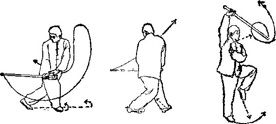 (2)左挂剑重心上升右脚向左垫半步左脚向左跨步。体向左转180度两腿交叉重心下降成左高蛇盘步跨步转体的同时,右手握剑与左手剑指一齐使剑向前上、向下划弧经左腿外侧再用力向后上抄起着力点在剑刃9左手剑指随之而动扶在右手腕上指尖向右前方手心向下目视左下方(图