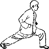 动作一腿向前一大步(约为本人脚长的4?5倍)脚尖微向内扣屈膝半蹲(大腿接近水平)膝与脚尖在一垂直线上另一腿挺膝伸直脚尖内扣(斜向前方)°两脚玲全脚掌着地上体正对前方目向前平视,两手抱拳于腰间(图1 )