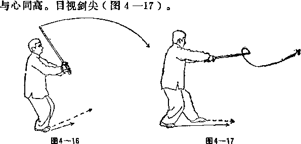 伽跟进并放在左脚内侧重心落于左唧成右并步上步同时双手握剑右臂外旋使剑平剑停于胸前。目视前方(图4-18)。