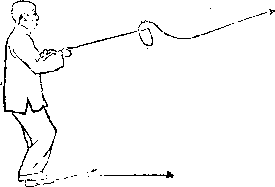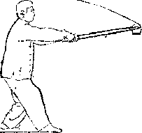 2)右扑剑、上动不停体向右转90度面向东南方右脚1向右前方上一大步左脚跟进半步屈膝半蹲成右四六步进步同时双手握剑使剑向下、向右上摇动再立剑向前崩出力达剑尖与肩同高。目视剑尖(图4一19)