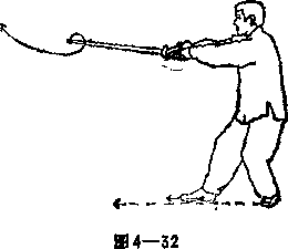 (2) 右落剑言上动不停身体继续向右转90度共180度+右脚向前上一大步左脚跟进半步屈膝半蹲成右四六步。进步同时双手撞剑右臂内旋使剑由左向下十再向右上逆时针绕环立剑向前下劈心剑尖向前与心同高略高于剑柄。目视剑尖(图—32)