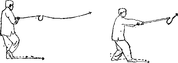 步,左脚随之跟进半步屈膝半蹲成右四六步。同时双手握剑,右臂微内旋使剑向下、向右再向上逆时针绕环用小指一侧的剑刃向右前铿割着力点由剑刃最前端向后移。剑尖向左前方停于胸前,与心同高。目视剑刃(图4一38)鼻
