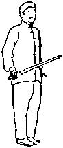 (1)面向东南方身体直立头要端正上项肩松肘坠眼平舌卷气沉丹田。右手握剑立剑停于胯右侧剑尖向前剑刃与地面平行3卷手剑指停于胯左侧指尖向前手心向下(图4—55)