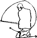 (1) 左蛇盘勾剑上动略停左脚向前垫半步全脚掌着地并外展体向左转90度右陶随之跟进脚跟离地重心偏于左腿两腿屈膝下蹲成左蛇盘步。同时双手握剑使剑贴左腿外侧同朝虎口一侧的剑刃向左下再向左上勾起着力点在剑刃,屈肘屈腕势如抄物。目随剑行(图4一95)