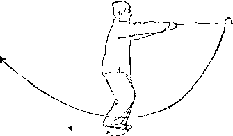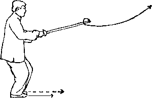 (?)右蛇拨草剑上动不停右脚向前上一大步多左脚随之踉进屈膝半蹲成右四六步%上步同时双手握剑右臂内旋使剑向右上、向左下摇动再用小指一侧的剑刃向前撩出。剑尖与裆部同高低于剑柄。目随剑行(图4一98兀