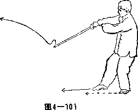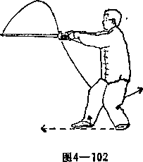 (2)四六步刺剑上动不停右脚向前上一步9左脚随之跟进屈膝半蹲成右四六步口进步同时双手握剑右臂外旋向前刺出。目视剑尖(图4—102)