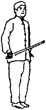 平舌卷气沉丹田右手握剑立剑停于胯右侧,剑尖向前剑刃与地面平行左手剑指停于胯左侧