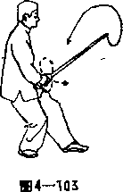 上动略停重心后移,右腿屈滕半窗左桐微向左移动成左四六步好双手握剑将剑拉回停于右胯前剑尖向前上方与肩同高』目视前方(图4—103)