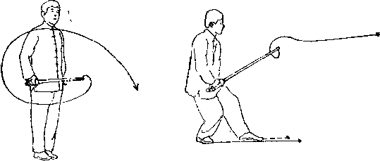 (2) 舶形左剑上动不停左脚向前进一大步,布脚随之跟进丽膝半蹲成左四六步。上步同时双手握剑右皆外旋使剑