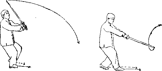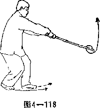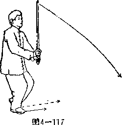 图4-121图4-1214-1224-122(1)左丁步抱剑上动略停右脚向右前方上一大步屈膝半蹲左脚随之跟进贴于右脚内侧脚尖内扣并虚点地面成左丁步。上步同时双手握剑右臂内旋沉腕下压使剑尖向回划