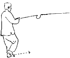 蹲有脚随之躁进,贴于左脚内侧脚尖内扣并虚点地面成右丁步令进步同时双手握剑右臂外旋,使剑向左下再向右上摇动屈肘平御停于胸前剑尖向前与胸同高。目视前方(图4-1190