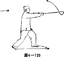 (2)熊形起剑上动不停重心右糖右脚原地不动脚前掌蹬地脚跟提起左脚向前垫半步重心偏于左腿。垫步同时,双手握剑使剑向左下、再向右上摇动平剑向前钻出剑尖与喉同高剑柄与胸平。目视剑尖(图4-120)