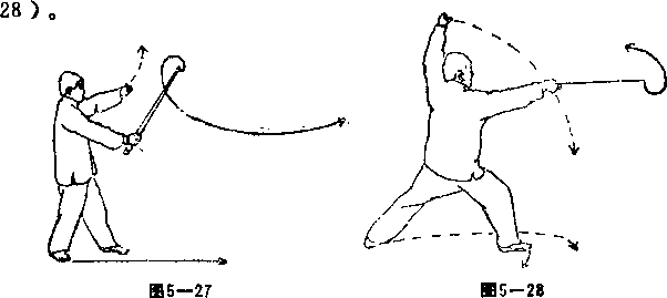 (1) 左虚步持剑普上动略停左脚向前一步以前脚掌着地右腿微屈膝成左高虚步右手压握剑臂外旋,使剑尖向上划弧停于头前方右手心向左左手剑指随之而动直臂上绕至体前指尖向右上手心向前目祝剑刃(图5-27)