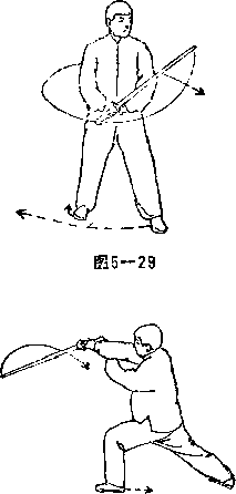 剑尖向左上与肩同高右手握剑椭于腹前右手心向内左手剑指随之而动向下划弧扶在右手腕上指尖向右手心向下。目视剑尖(图5—29)。