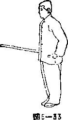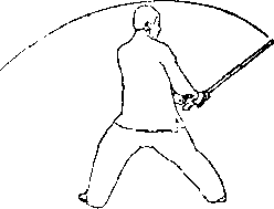 上动不停身体微向左转左脚收回与右脚并拢两腿伸直。转体同时右手握剑使剑向右下、向上再向下绕环收至胯右侧剑尖向前略高于剑柄同时左手剑指问左下、向上再向下绕环停于胯左侧。眼平舌卷气沉丹田(图5—33)°