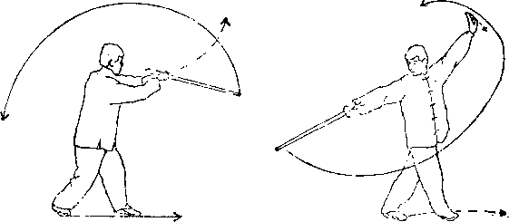 (1)左裹砍上势不停左脚向前垫半步脚尖内扣膝部撤屈同时右腿略前移成左四六步。垫步同时右手钳握剑臂外旋手心向右上方使剑向左上弧形裹砍剑尖与肩平略低
