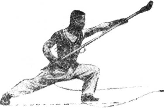 接前势。左脚落地向前迈出一大步,左膝前弓,右腿? 直,呈左弓步I同时,铲向前上方铲出,左臂伸直,手心向 上,铲与头平。眼视铲锋(图4)。