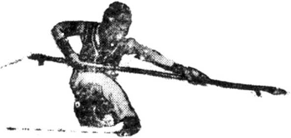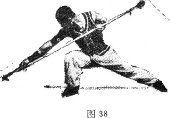前弓,左腿蹬直,呈右弓步同时,Jj牙部分随转体方向向 右T方推出,右臂伸直,手心向下。眼视月牙(图38)。