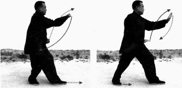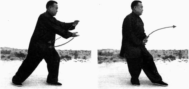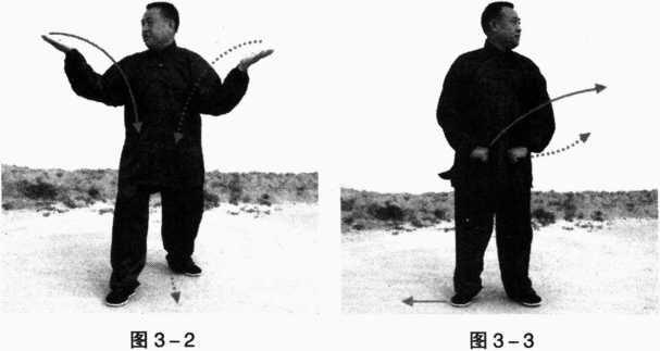 (三) 重心移左脚,左膝微屈,右脚向右侧撤步,前脚掌点 地,脚跟提起;同时身体左转约90度,两掌由腹前向左侧前伸, 臂微屈,右手掌心向上,左手掌心向下,目视两手(图3-4)。