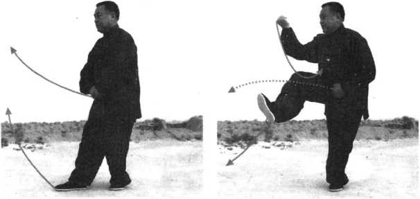 要 点:崩拳转身时,身体不可忽高忽低或左右摇摆,右掌上钻 与右膝上提蹬腿,动作要一致,左手前劈与右脚落地需整齐合一。
