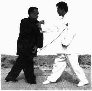 我以左势三体势对方右直拳崩来我以右手向右迎拿左腿前移进步左手手心朝上从对方臂上向前朝对方喉部以虎口横铲。对方左手迎解我即左手顺势内旋反手拿腕回拉同时右脚右前跨向左拧腰右手同时向对方左臂掩肘着力随即向右移靠右掌从对方臂上方手心朝上向右朝对方喉部铲靠并以前