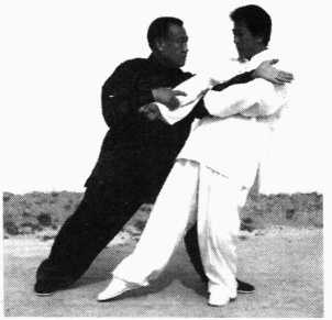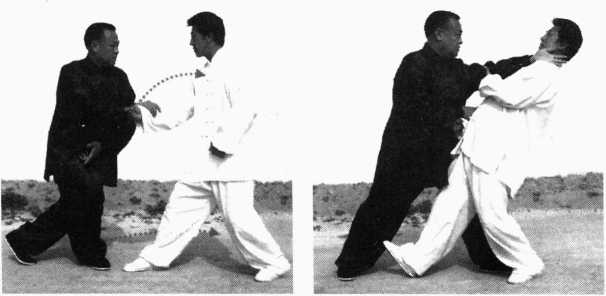 注意左脚控制下肢缠绕拴手束身吸引随势粘靠猛力靠撞整劲刚发。